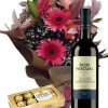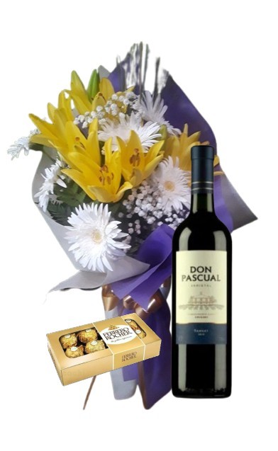 Ramo de 6 gerberas blancas y 2 lilium amarillos con bombones Ferrero Rocher 8 uds y vino Don Pascual Tannat, Un ramo de gerberas y liliums simboliza alegría y admiración. Las gerberas, con sus colores vibrantes, representan energía, optimismo y pureza de sentimientos. Los liliums, con su elegancia y fragancia, expresan amor, gratitud y renovación espiritual. Juntas, forman un mensaje de luz, aprecio y esperanza.