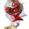 Ramo de 6 gerberas rojas y 2 lilium amarillos con bombones Ferrero Rocher 8 uds, Un ramo de gerberas y liliums simboliza alegría y admiración. Las gerberas, con sus colores vibrantes, representan energía, optimismo y pureza de sentimientos. Los liliums, con su elegancia y fragancia, expresan amor, gratitud y renovación espiritual. Juntas, forman un mensaje de luz, aprecio y esperanza.