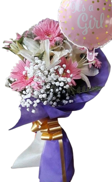 6 gerberas rosadas y 2 lilium blanco con globo «It´s a girl»