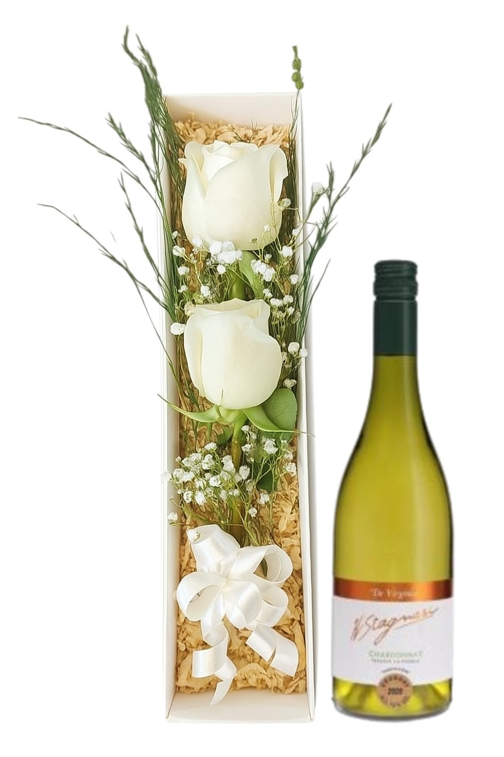 Caja de 2 rosas blancas con vino Stagnari Chardonnay De Virginia
