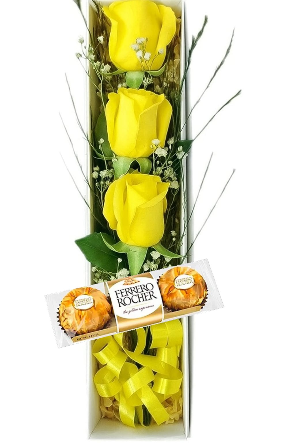 Caja de 3 rosas amarillas con bombones Ferrero Rocher 3 uds