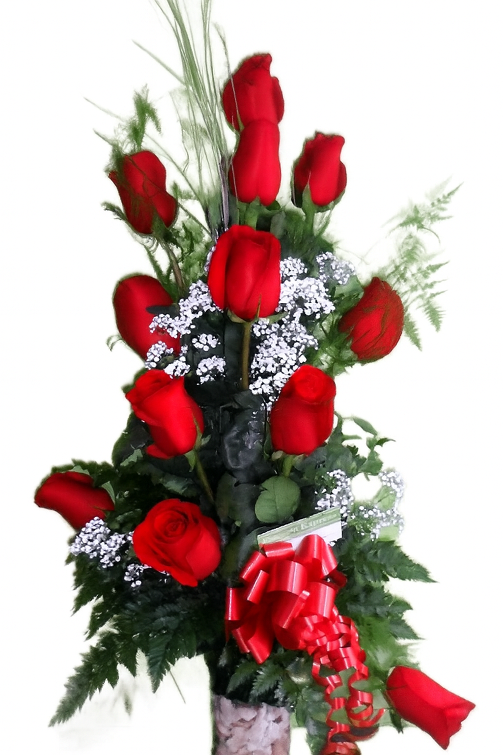 Copa con 12 rosas rojas, ilusiones y follajes de estación.