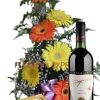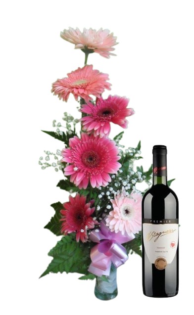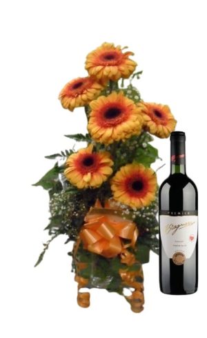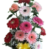 Colorida copa de 6 gerberas en base de vidrio con malla,ilusiones y follajes de estacion.