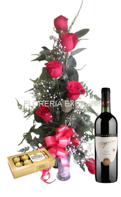 Copa de 6 Rosas Rojas con bombones Ferrero Rocher 8 uds y vino Stagnari Tannat, Copa con rosas símbolo de amor profundo, pasión y compromiso. Un detalle elegante que transmite emociones intensas y sinceras. Ideal para sorprender a alguien especial o decorar con un toque romántico y lleno de significado