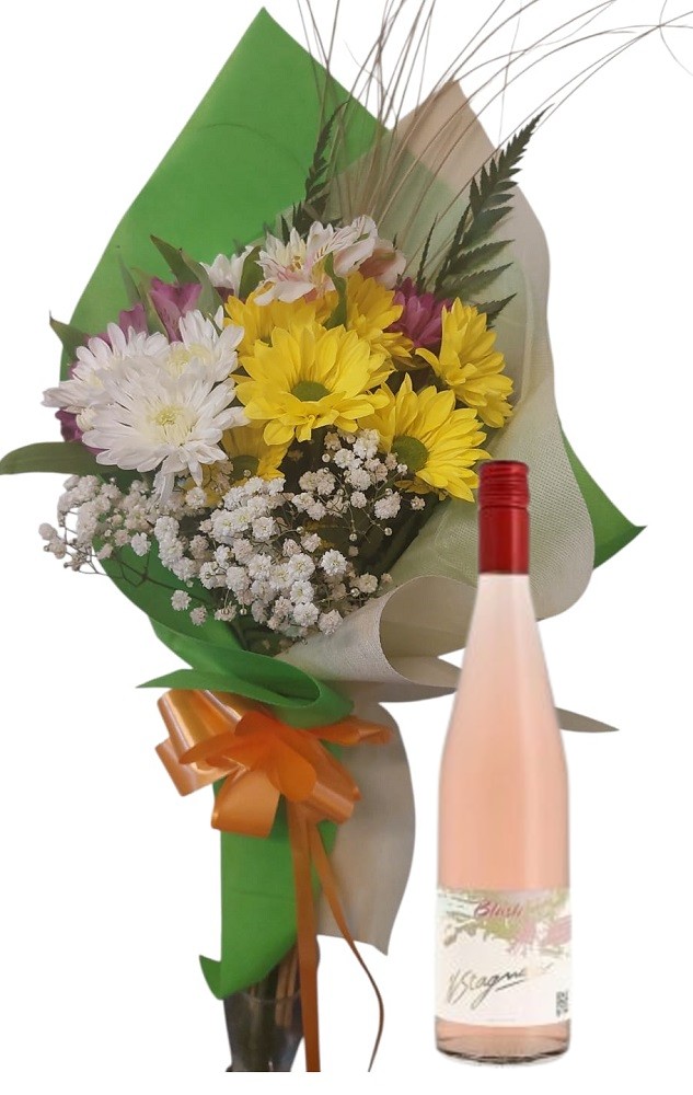 Ramo mixto chico de felpilla y astromelias con Vino Stagnari Blush, perfecto para alegrar cualquier espacio. Incluye una variedad de flores frescas y vibrantes en tonos brillantes y suaves.