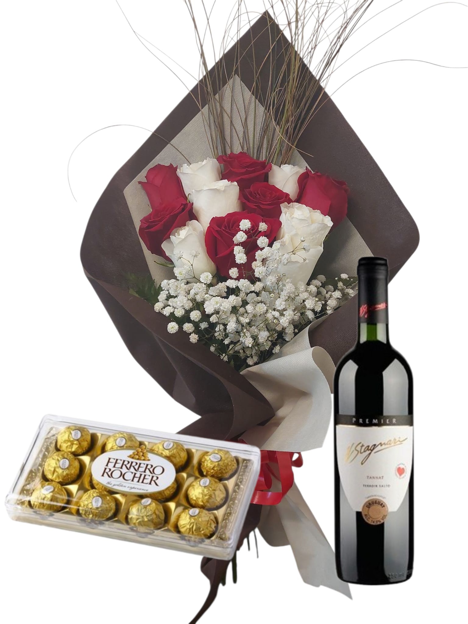 Ramo 12 Rosas Combinadas (rojas y blancas) con Bombones Ferrero Rocher 12 unidades + Stagnari Tannat