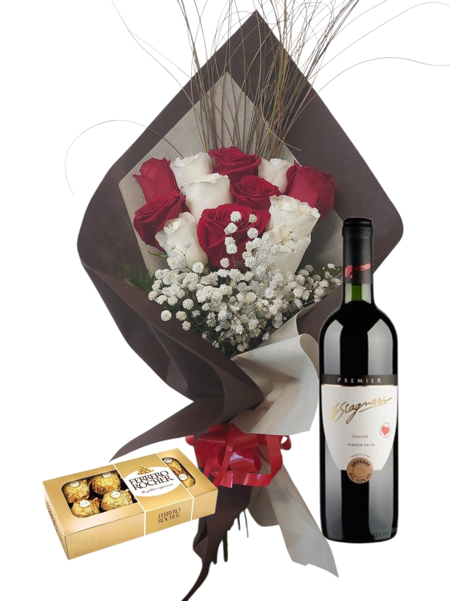 Ramo 12 Rosas Combinadas (rojas y blancas) con Bombones Ferrero Rocher 8 unidades y vino Stagnari Tannat