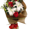 Importante ramo de 50 rosas rojas de tallo largo envuelto con telas, moño y follajes.