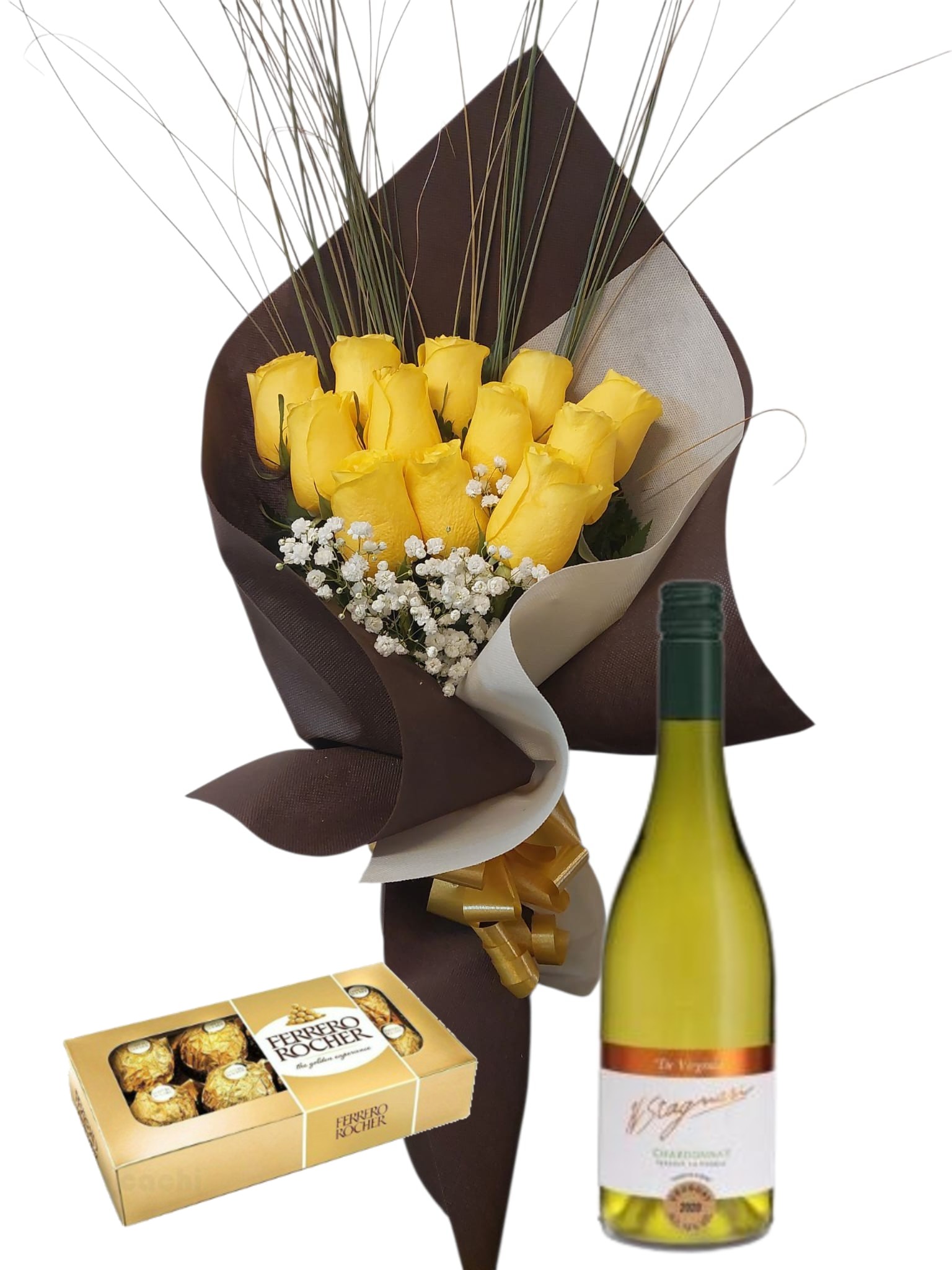 Ramo de 12 rosas amarillas con bombones Ferrero Rocher 8 uds y vino Stagnari chardonnay de virginia