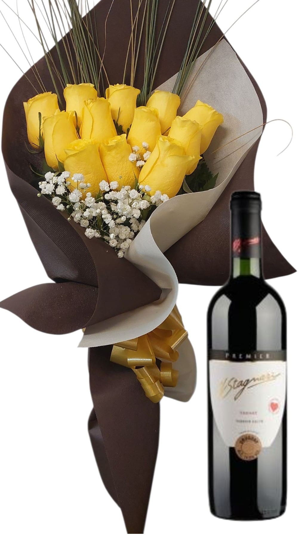 Ramo de 12 rosas amarillas con vino Stagnari Tannat , Las rosas amarillas son símbolo de amistad, alegría y nuevos comienzos. Perfectas para compartir momentos felices.