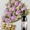 Ramo de 12 rosas lilas con astromelias, bombones Ferrero Rocher 12 uds y Vino Stagnari Blush