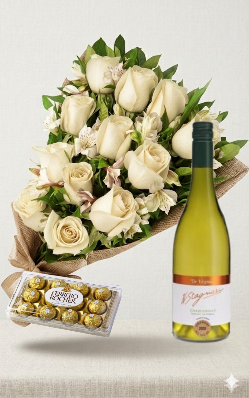 Ramo de 12 rosas blancas con astromelias, bombones Ferrero Rocher 12 uds y Vino Stagnari Blush
