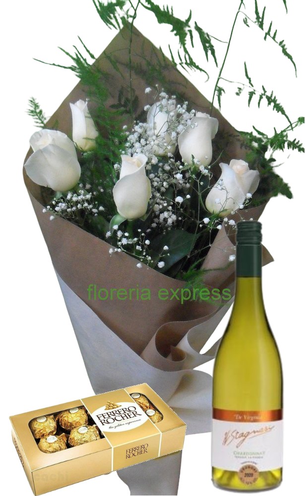 Ramo de 12 rosas blancas con bombones Ferrero Rocher 8 uds y vino Stagnari Chardonnay de virginia