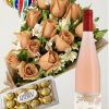 Ramo de 12 rosas beige y astromelias con bombones Ferrero Rocher 12 uds y champagne