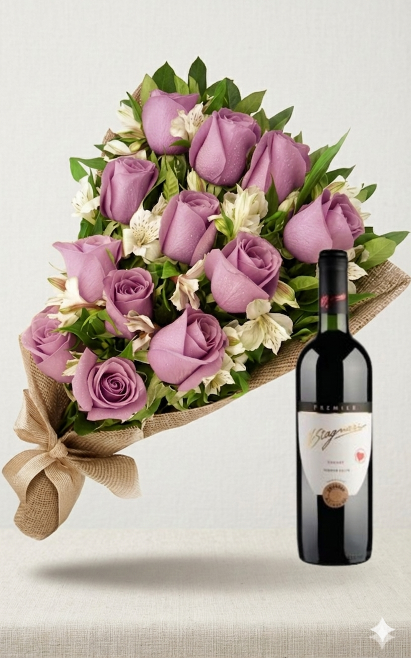 Ramo de 12 rosas lilas con astromelias y Vino Stagnari Chardonnay De Virginia