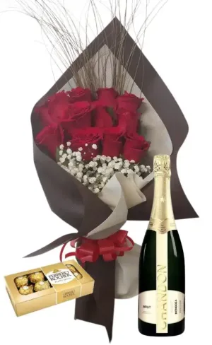 Ramo De 12 Rosas rojas + Champagne + Bombones ferrero x8un