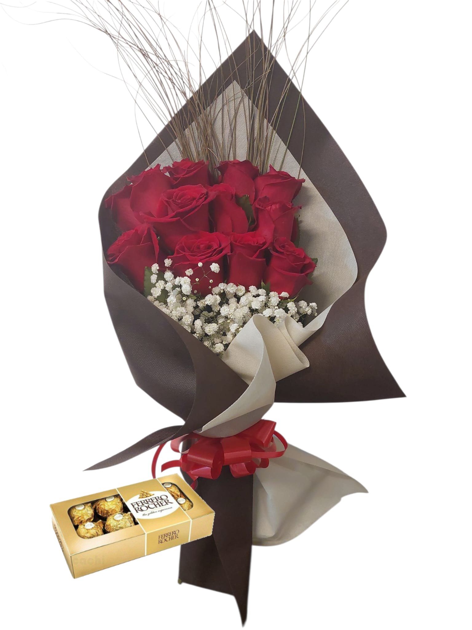 Ramo de 12 rosas rojas con bombones Ferrero Rocher 8 uds, La pasión y el amor se reflejan en nuestras rosas rojas. Perfectas para expresar sentimientos profundos y románticos.
