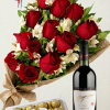 Ramo de 12 rosas rojas y astromelias con bombones Ferrero Rocher 12 uds y Vino Stagnari Tannat Premier, Este ramo representa la diversidad de los sentimientos y la belleza de lo inesperado. Cada color simboliza una emoción distinta: alegría, gratitud, amor, perdón, esperanza. Juntos, forman un mensaje honesto y profundo.