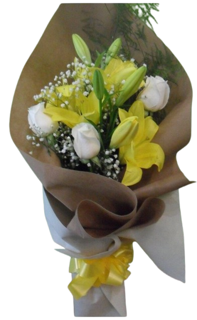 Ramo de 3 rosas blancas y lilium amarillo, Rosas y liliums combinan amor profundo y pureza. Las rosas expresan pasión, gratitud o admiración, según el contexto. Los liliums simbolizan respeto, renovación espiritual y nobleza. Juntas, representan sentimientos sinceros y elegantes.