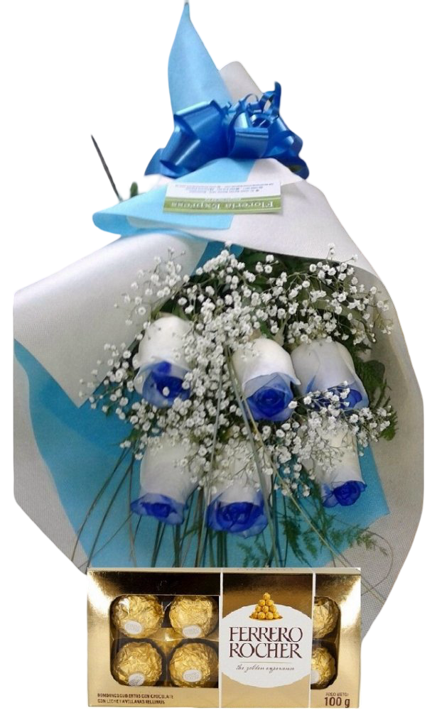 Ramo de 6 rosas azules con bombones Ferrero Rocher 8 uds, Las rosas azules transmiten misterio y serenidad, ideales para sorprender con algo único y sofisticado.