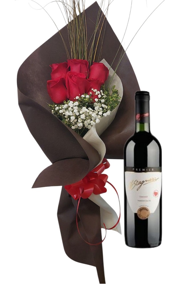 Ramo de 6 rosas rojas y Vino Stagnari Tannat Premier, La pasión y el amor se reflejan en nuestras rosas rojas. Perfectas para expresar sentimientos profundos y románticos.