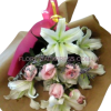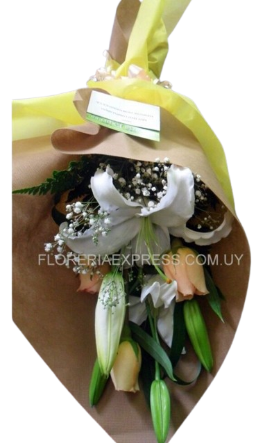 Ramo mixto 3 rosas beige Y 1 lilium blanco, Rosas y liliums combinan amor profundo y pureza. Las rosas expresan pasión, gratitud o admiración, según el contexto. Los liliums simbolizan respeto, renovación espiritual y nobleza. Juntas, representan sentimientos sinceros y elegantes.