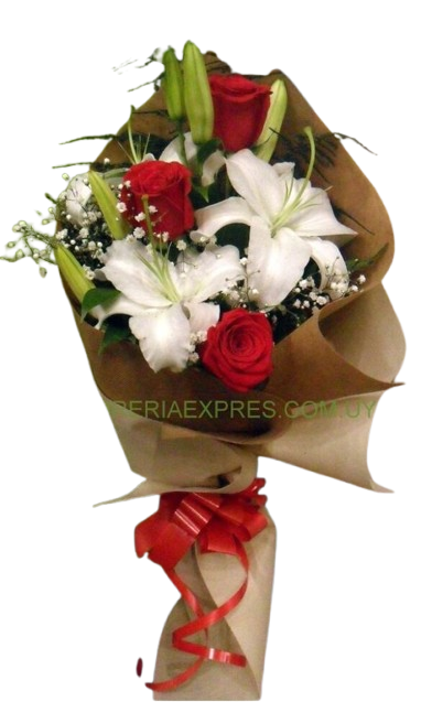 Ramo mixto 3 rosas rojas y 1 lilium blanco, Rosas y lilium combinan amor profundo y pureza. Las rosas expresan pasión, gratitud o admiración, según el contexto. Los liliums simbolizan respeto, renovación espiritual y nobleza. Juntas, representan sentimientos sinceros y elegantes.