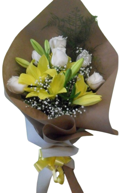 Ramo mixto de 6 rosas blancas y 2 liliums amarillos, Rosas y liliums combinan amor profundo y pureza. Las rosas expresan pasión, gratitud o admiración, según el contexto. Los liliums simbolizan respeto, renovación espiritual y nobleza. Juntas, representan sentimientos sinceros y elegantes.