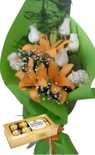 Ramo mixto 6 rosas blancas y 2 liliums naranjas con bombones Ferrero Rocher 8 uds, Rosas y liliums combinan amor profundo y pureza. Las rosas expresan pasión, gratitud o admiración, según el contexto. Los liliums simbolizan respeto, renovación espiritual y nobleza. Juntas, representan sentimientos sinceros y elegantes.